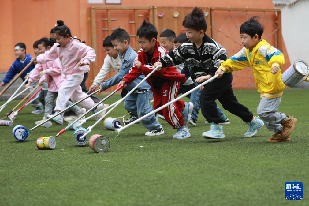 4月22日,在湖南省湘西土家族苗族自治州吉首大学师范学院附属小学教育集团附属幼儿园,小朋友进行“环保滚筒”游戏。(新华社发 彭彪 摄)