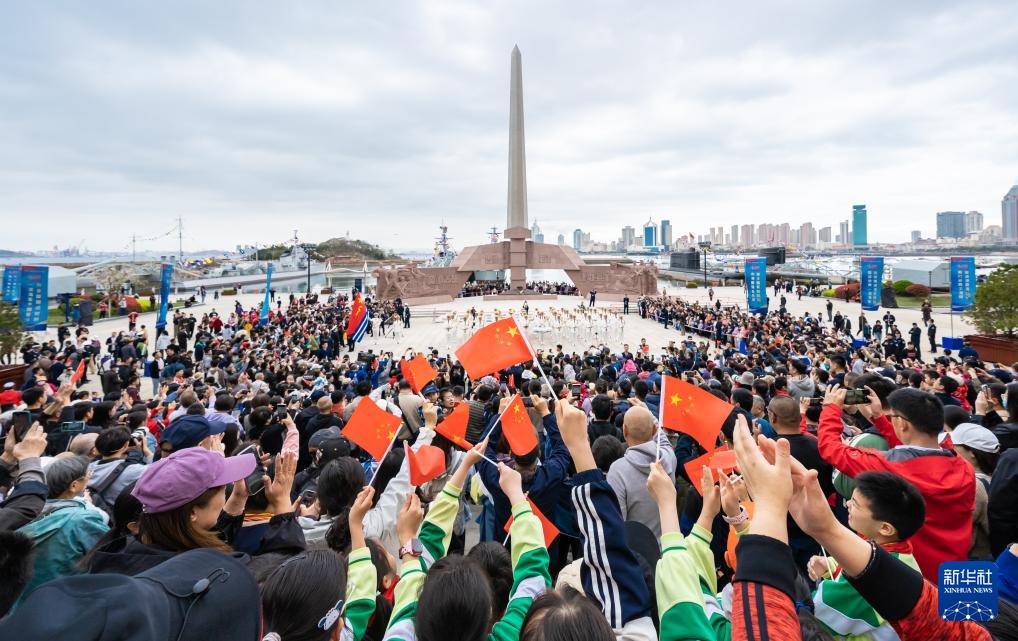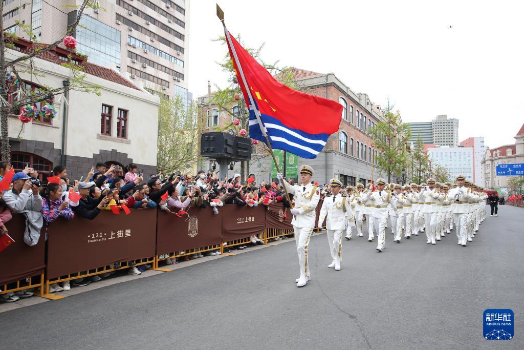 中国人民解放军海军军乐队在山东省青岛市市区举行庆祝人民海军成立75周年军乐展演活动(4月20日摄)。(新华社发 陈梦曦 摄)