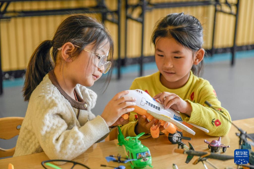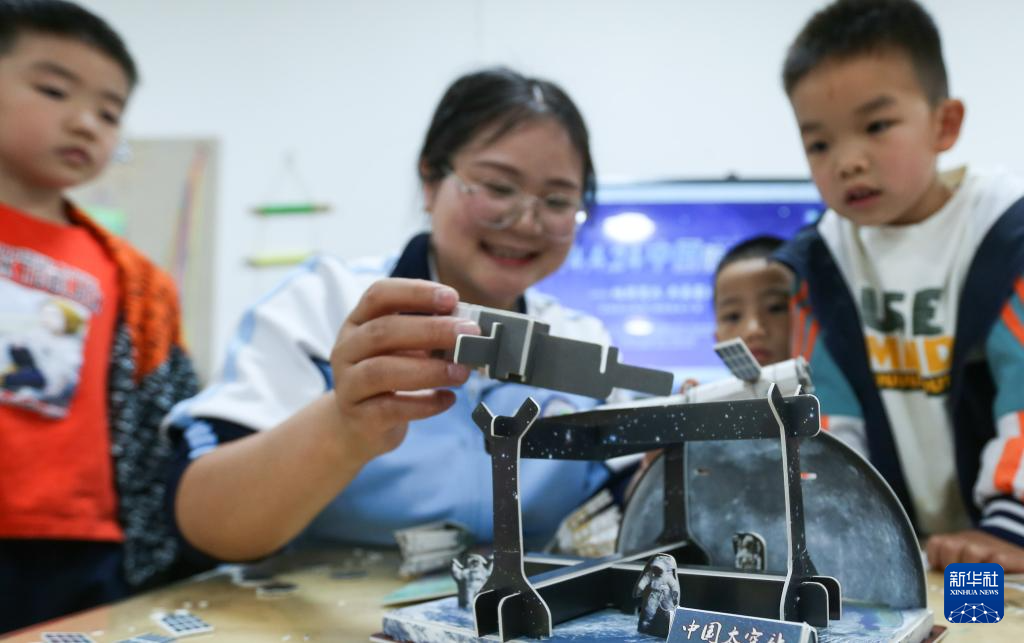 4月24日,贵州省都匀市青云湖幼儿园的老师和孩子们一起拼装空间站模型。(新华社发 肖伟 摄)