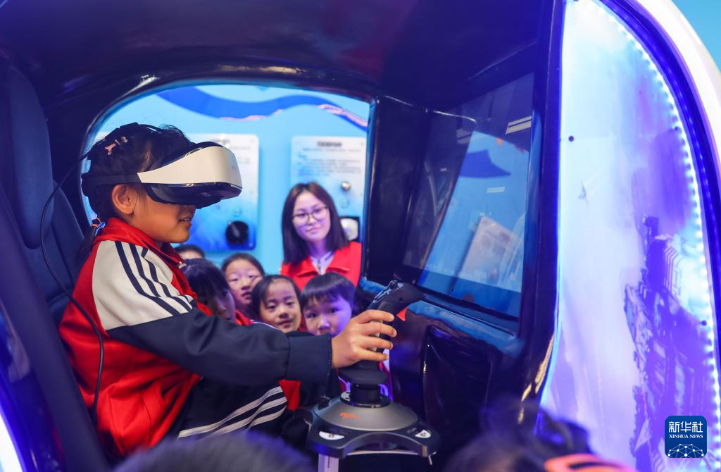 4月24日,在山东省青岛市李沧区世园街道金水东路社区新时代文明实践站太空科普馆,学生利用VR设备模拟体验太空飞行。(新华社发 张鹰 摄)