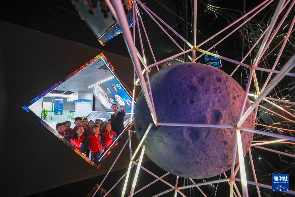 4月24日,浙江省湖州市德清县地理信息科技馆的工作人员为孩子们讲解航天科技知识。(新华社发 王正 摄)