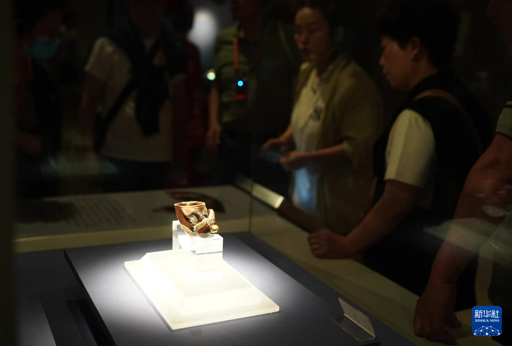 4月20日,游客在陕西历史博物馆内参观唐代文物镶金兽首玛瑙杯。(新华社记者 邵瑞 摄)