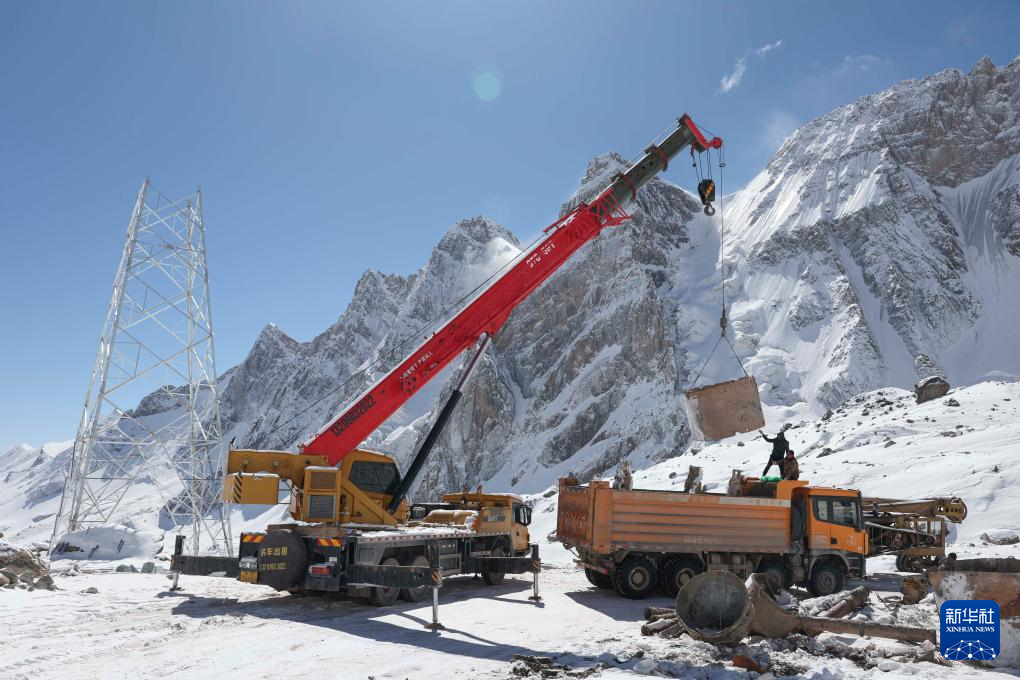 电力工人在位于新疆和田地区昆仑山区的施工现场吊装设备(4月25日摄)。(新华社记者 胡虎虎 摄)