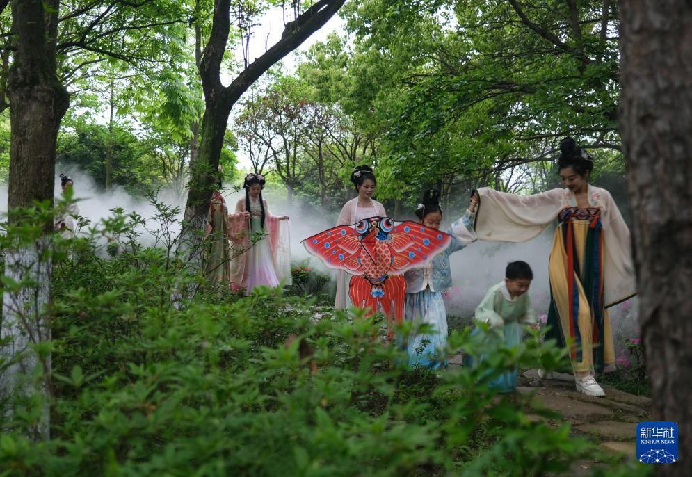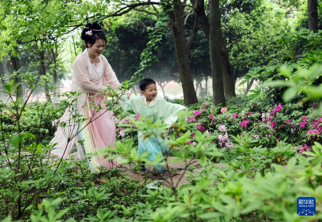 4月27日,汉服爱好者在植物园杜鹃谷游玩。为吸引游客,植物园推出汉服打卡地。(新华社记者 兰红光 摄)