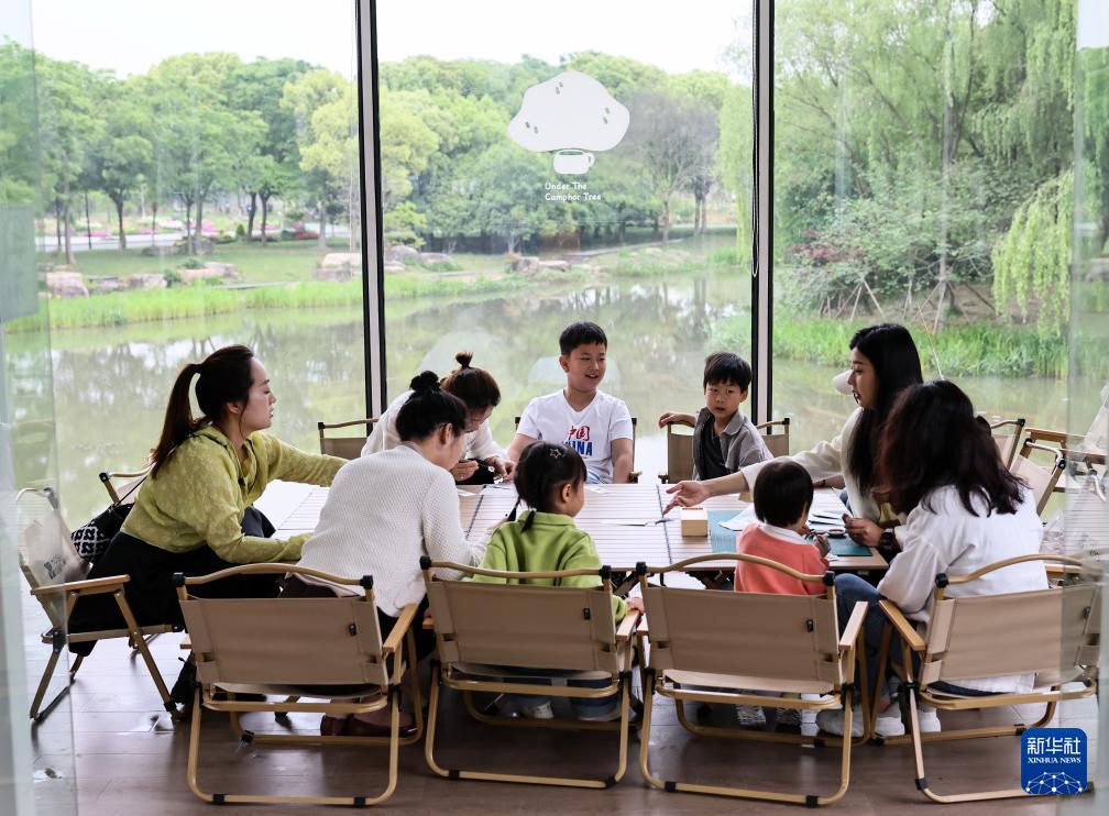 4月27日,市民在植物园内“禾城驿·温暖嘉”驿站里做亲子游戏。驿站内已实现了咖啡厅、休息室、卫生间、基本药物提供等服务,在满足市民休憩如厕需求的同时,回应市民亲近自然的意愿。(新华社记者 兰红光 摄)