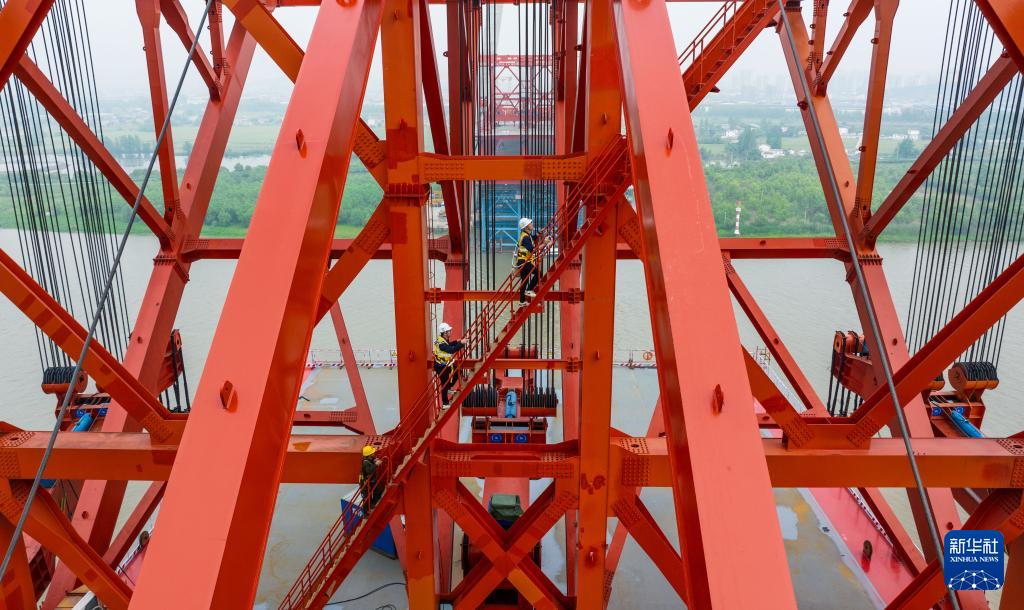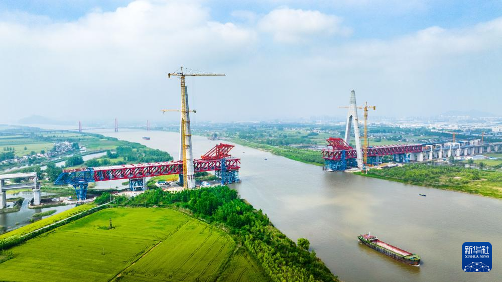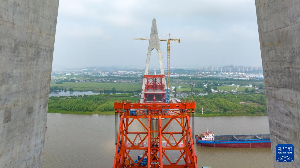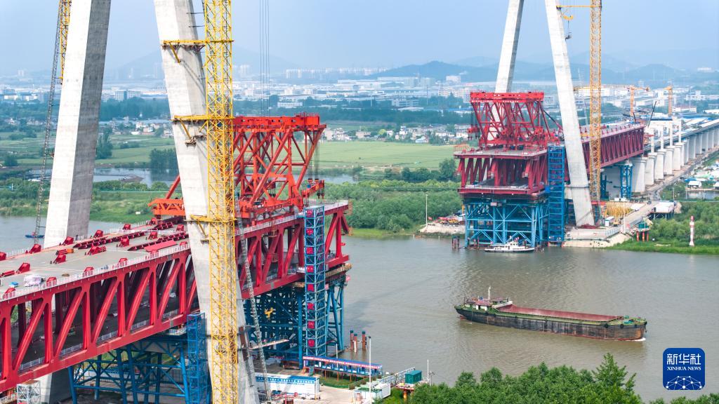 巢马铁路马鞍山长江公铁大桥副汊航道桥建设现场(4月29日摄,无人机照片)。(新华社发 刘玉才 摄)