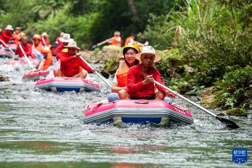 5月4日,游客在位于广西靖西市的古龙山峡谷群风景区漂流。(新华社发 赵京武 摄)