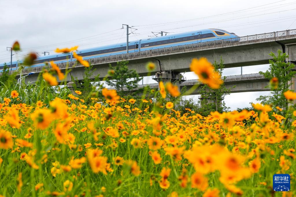 5月5日,一辆列车从安徽省黄山市徽州区西溪南镇的金鸡菊花海旁经过。(新华社发 施亚磊 摄)
