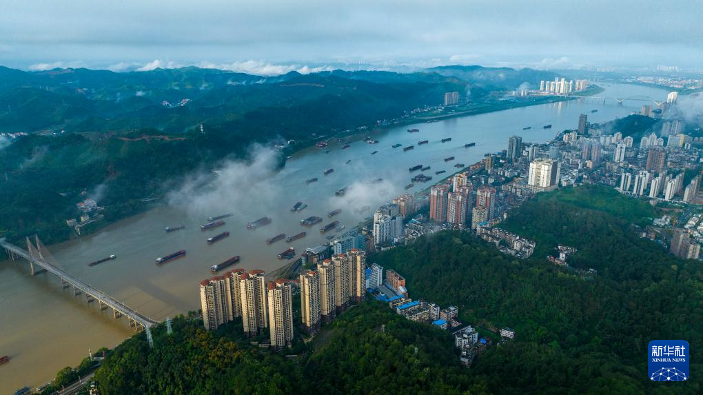 5月5日,在西江航运干线广西梧州市区段,往来船舶如梭(无人机照片)。(新华社发 何华文 摄)