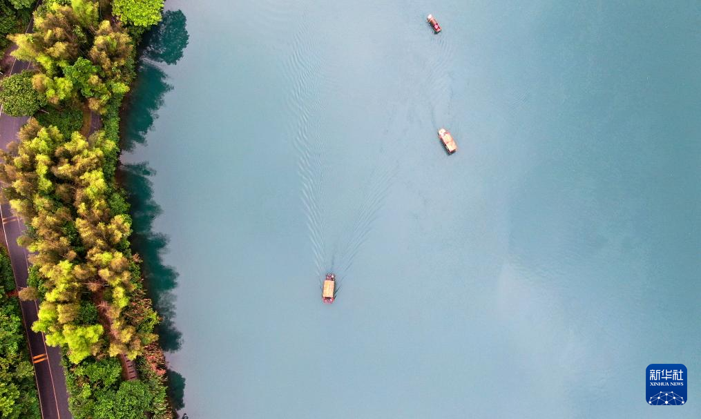 5月5日,游客乘坐游船在湖南省资兴市东江湖景区小东江景点游玩赏景(无人机照片)。(新华社发 李科 摄)