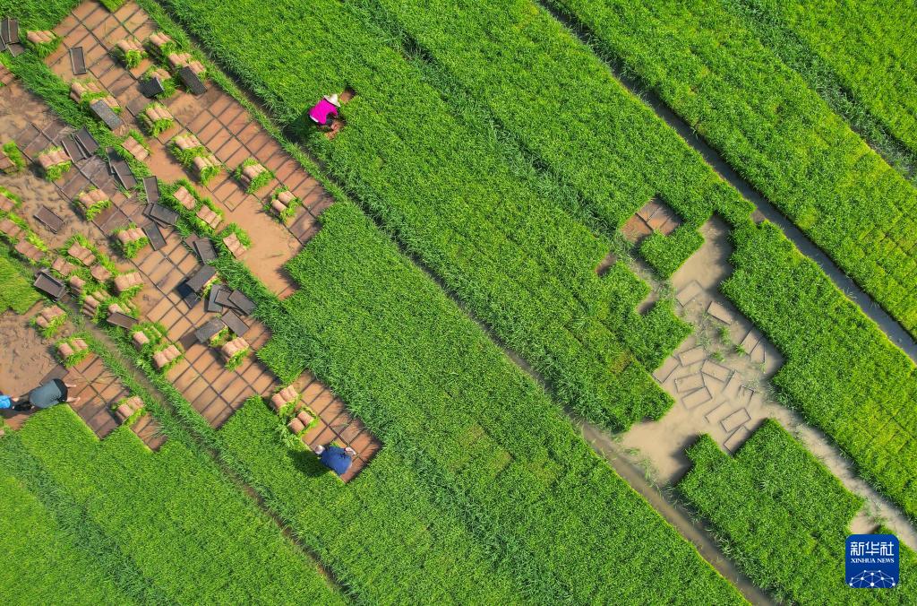 5月5日,在四川省内江市东兴区长江现代农业园区,农民在集中育秧基地起秧苗(无人机照片)。(新华社发 唐明润 摄)