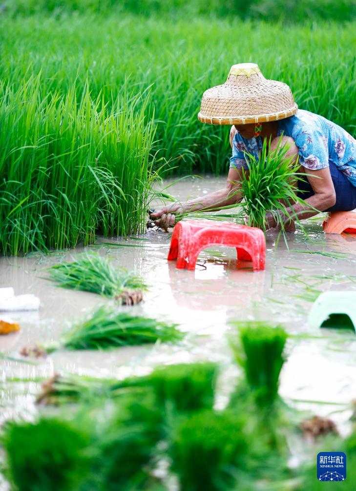 5月5日,村民在海南省三亚市天涯区槟榔村田间移秧苗。(新华社发 陈文武 摄)
