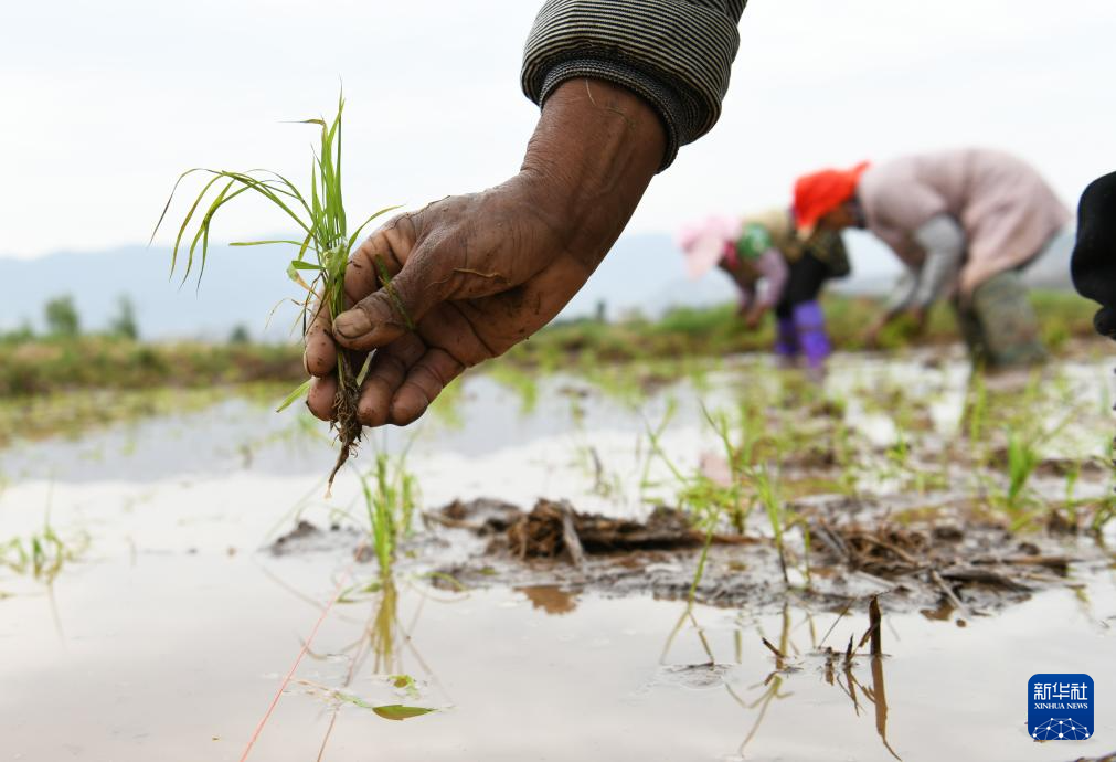5月5日,农民在云南省丽江市古城区金山街道东元社区的农田里移栽水稻秧苗。(新华社发 赵庆祖 摄)