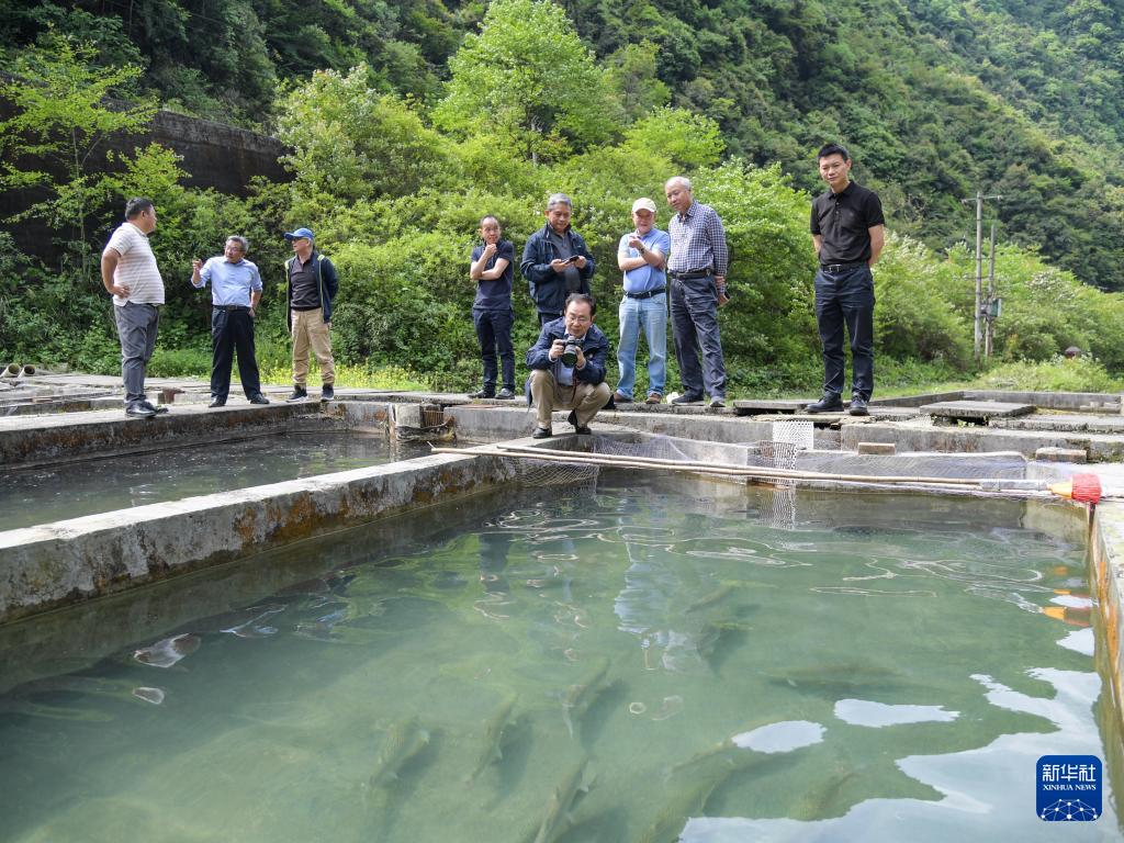 5月5日,在四川省崇州市鸡冠山冷水鱼科研基地,专家在进行川陕哲罗鲑全人工繁殖现场踏勘。(新华社记者 王曦 摄)