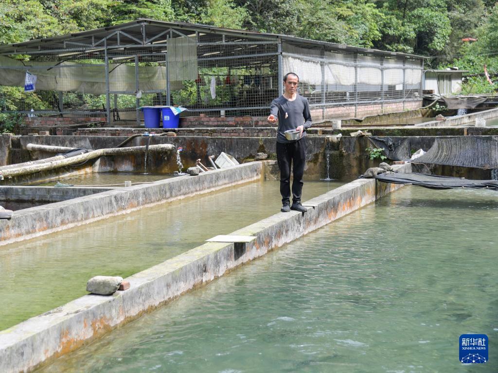 5月5日,在四川省崇州市鸡冠山冷水鱼科研基地,工作人员为川陕哲罗鲑后备亲鱼投喂饵料。(新华社记者 王曦 摄)
