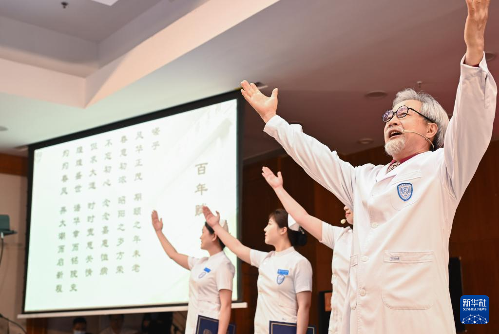 5月6日,演员和护士一起在活动上朗诵《百年赋》。(新华社记者 张玉薇 摄)
