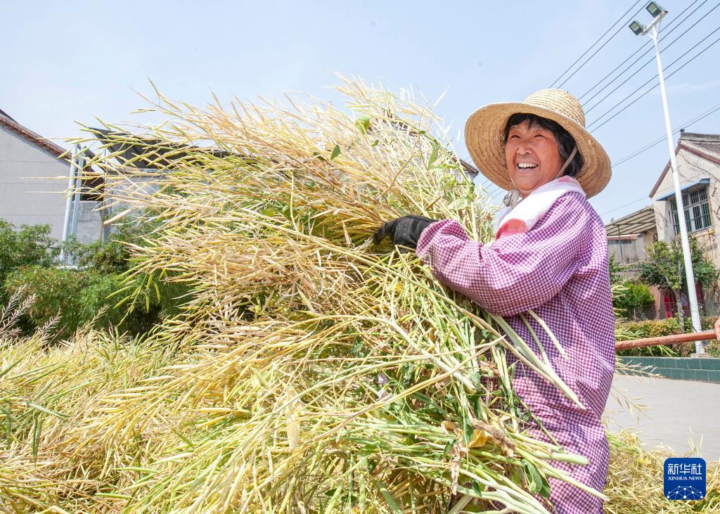 5月8日,在河南省焦作市博爱县鸿昌街道九街社区,村民晾晒刚收获的油菜籽。(新华社发 程全 摄)
