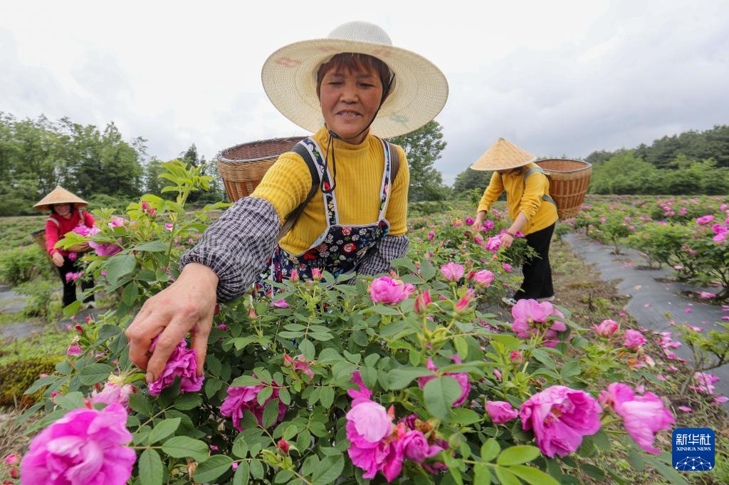 5月9日,村民在贵州省开阳县双流镇双永村玫瑰种植基地采摘玫瑰花。(新华社发 袁福洪 摄)