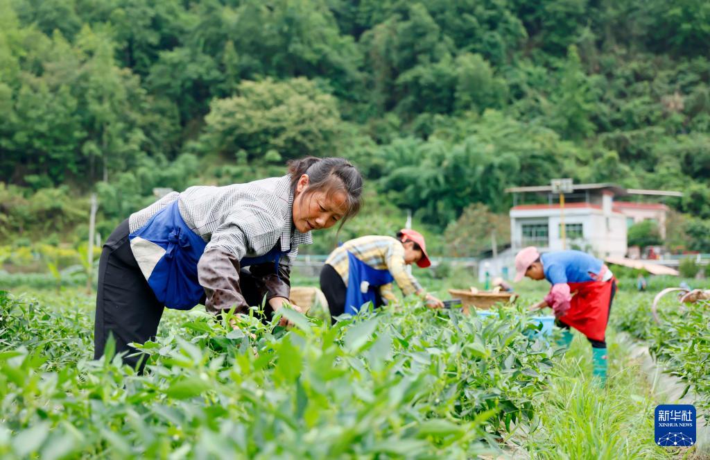 5月9日,村民在贵州省黔南布依族苗族自治州罗甸县逢亭镇祥脚村蔬菜种植基地采收辣椒。(新华社发 史传鸿 摄)