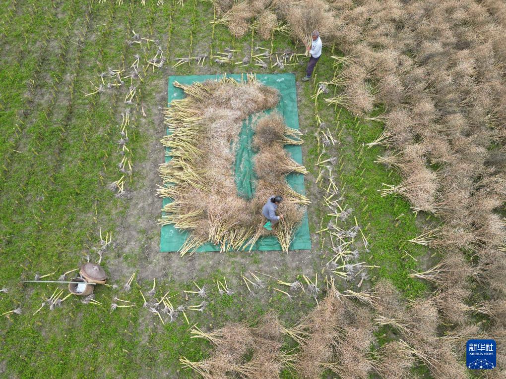 5月8日,在贵州省遵义市余庆县白泥镇民同村,村民在拍打油菜荚,分离油菜籽(无人机照片)。(新华社发 贺春雨 摄)