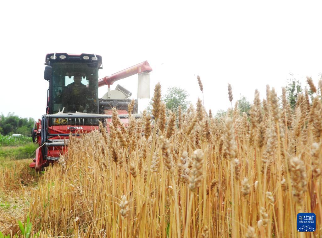 5月9日,在四川省达州市东部经开区麻柳镇刘家坝村,农机手驾驶收割机收割小麦。(新华社发 邓良奎 摄)