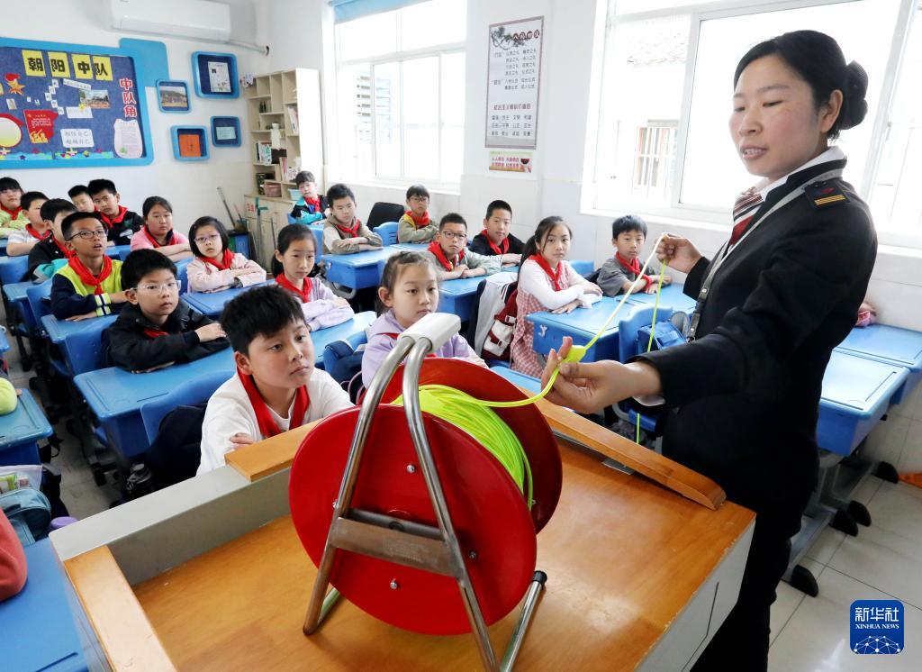 5月9日,在江苏省苏州市胥江中心小学校,苏州轨道交通2号线盘蠡路区域微型消防站队员向学生讲解救生照明线的功能。(新华社发 杭兴微 摄)