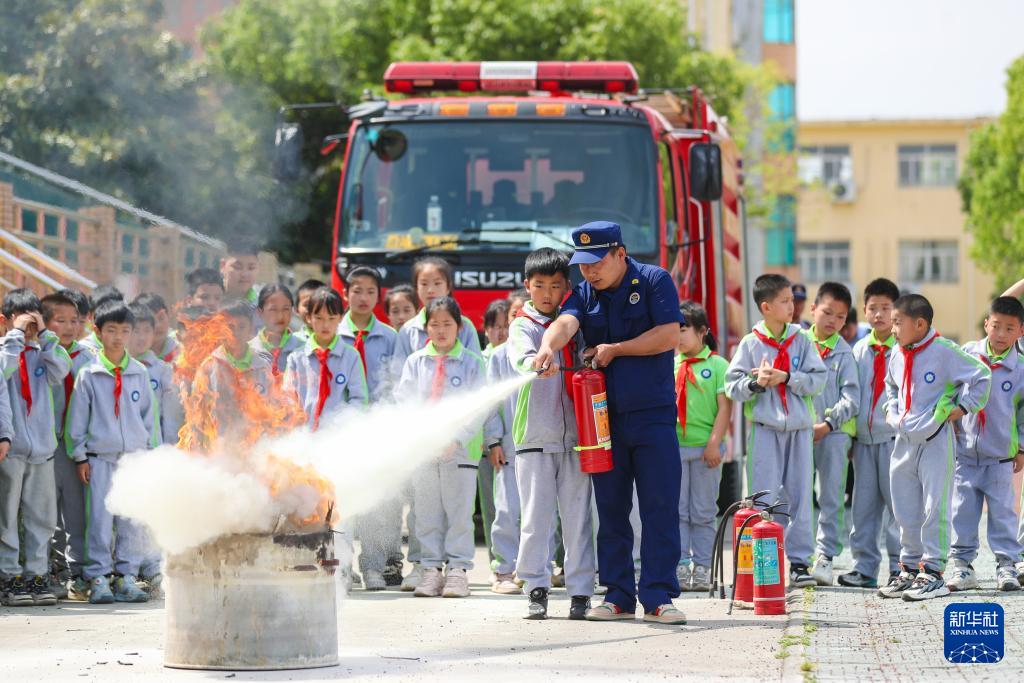 5月9日,浙江省湖州市德清县钟管小学学生在消防员指导下学习灭火器灭火。(新华社发 王正 摄)