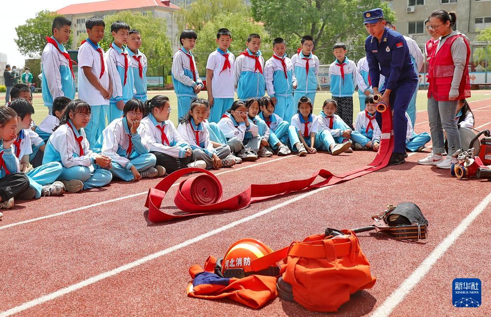 5月9日,河北省秦皇岛市海港区消防救援大队消防员为海港区燕秀里小学学生普及消防安全知识。(新华社发 曹建雄 摄)