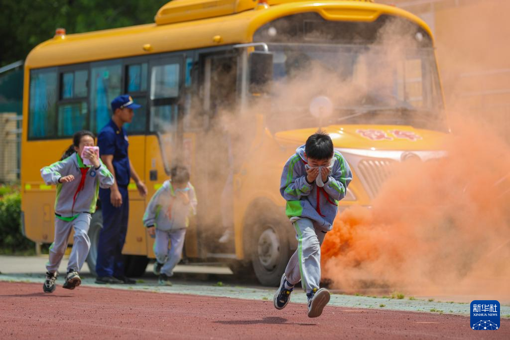 5月9日,浙江省湖州市德清县钟管小学学生在消防员指导下进行校车逃生演练。(新华社发 王正 摄)