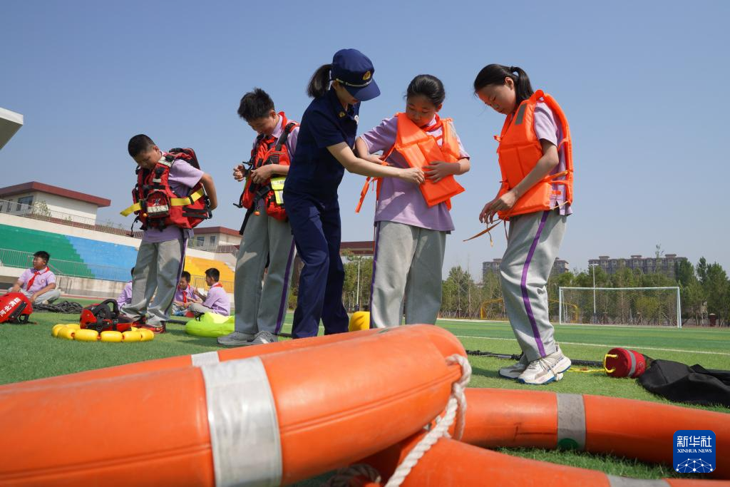 5月9日,在河北省邢台市内丘县朝阳小学,消防救援大队工作人员指导学生穿戴救生衣。(新华社发 刘继东 摄)