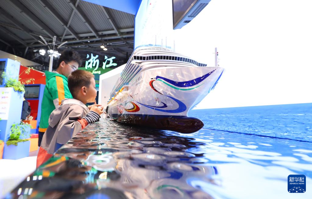5月12日,参观者在上海市展台近距离观看爱达魔都号邮轮模型。(新华社记者 方喆 摄)