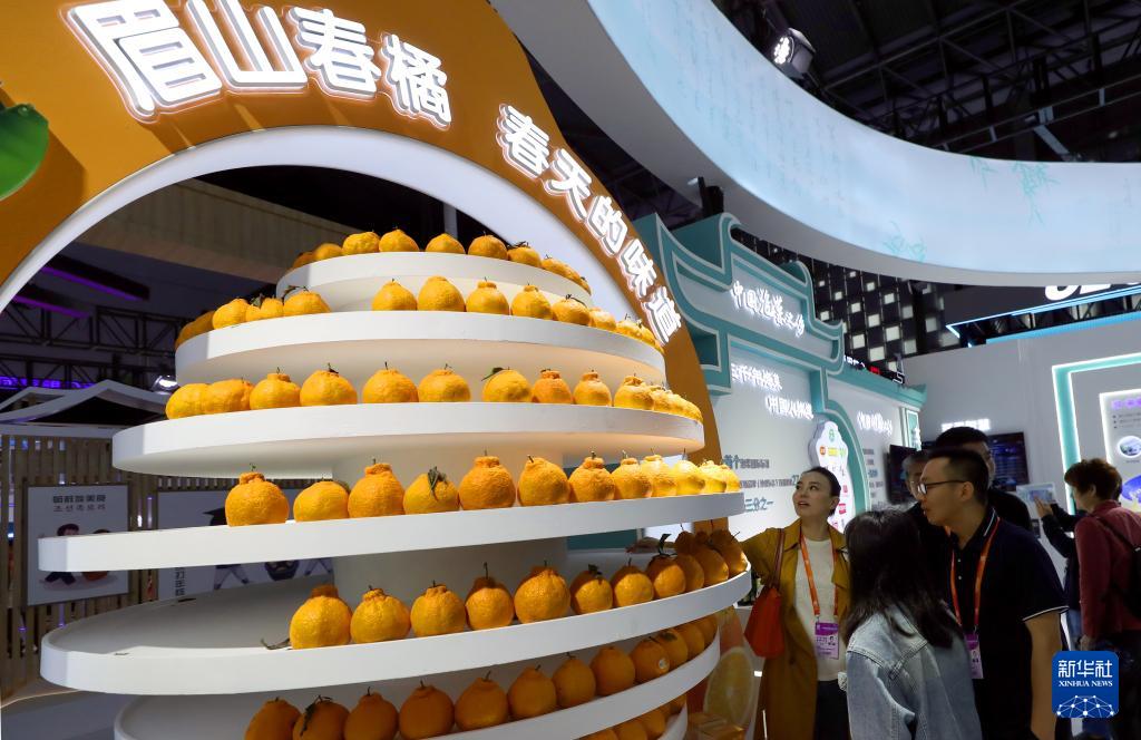 5月12日,参观者在四川眉山展台的橘子展品前驻足观看。(新华社记者 方喆 摄)