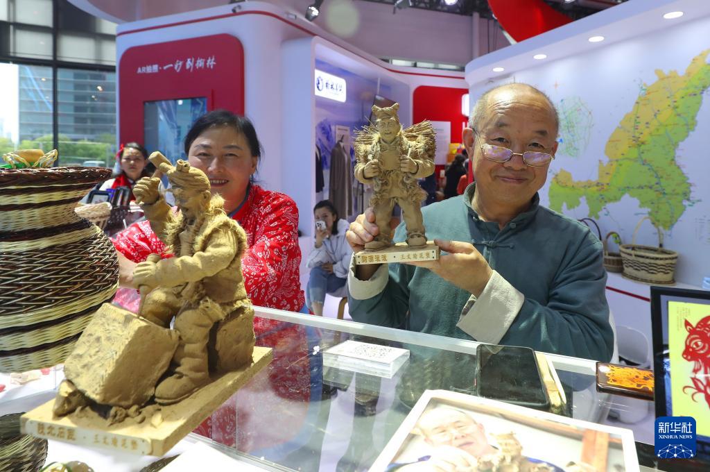 5月12日,来自陕西榆林的农民艺术家王文瑜(右)展示他的泥塑艺术作品《财源滚滚》。(新华社记者 方喆 摄)