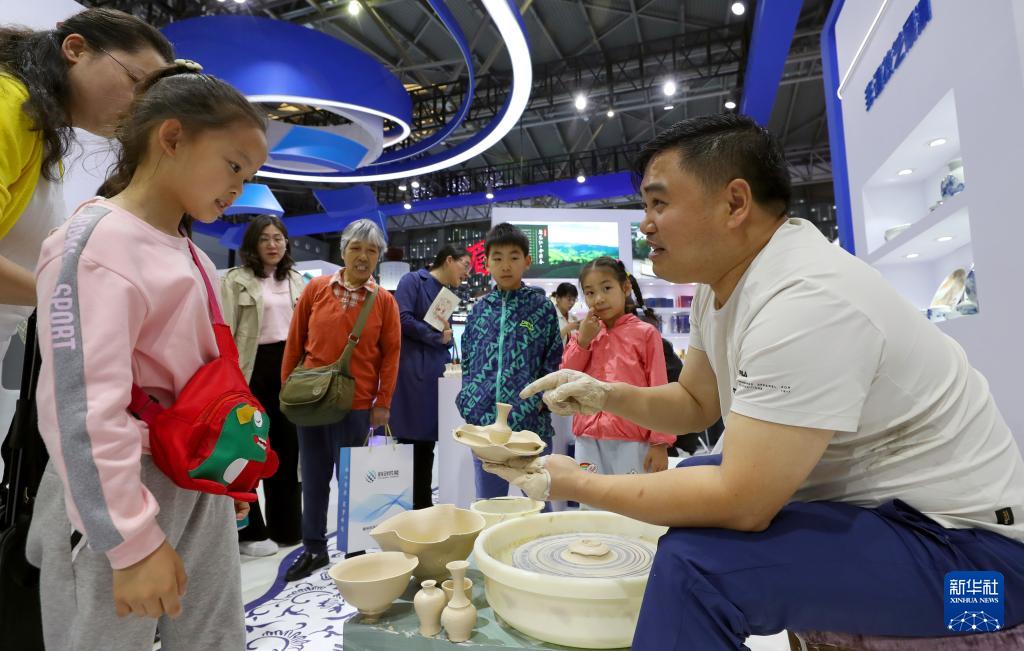 5月12日,江西景德镇展台的工作人员(右)向参观者介绍瓷器制作的步骤。(新华社记者 方喆 摄)