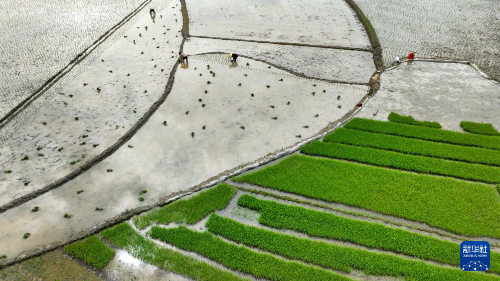 5月14日,村民在贵州省开阳县马头村移栽秧苗(无人机照片)。(新华社发 袁福洪 摄)