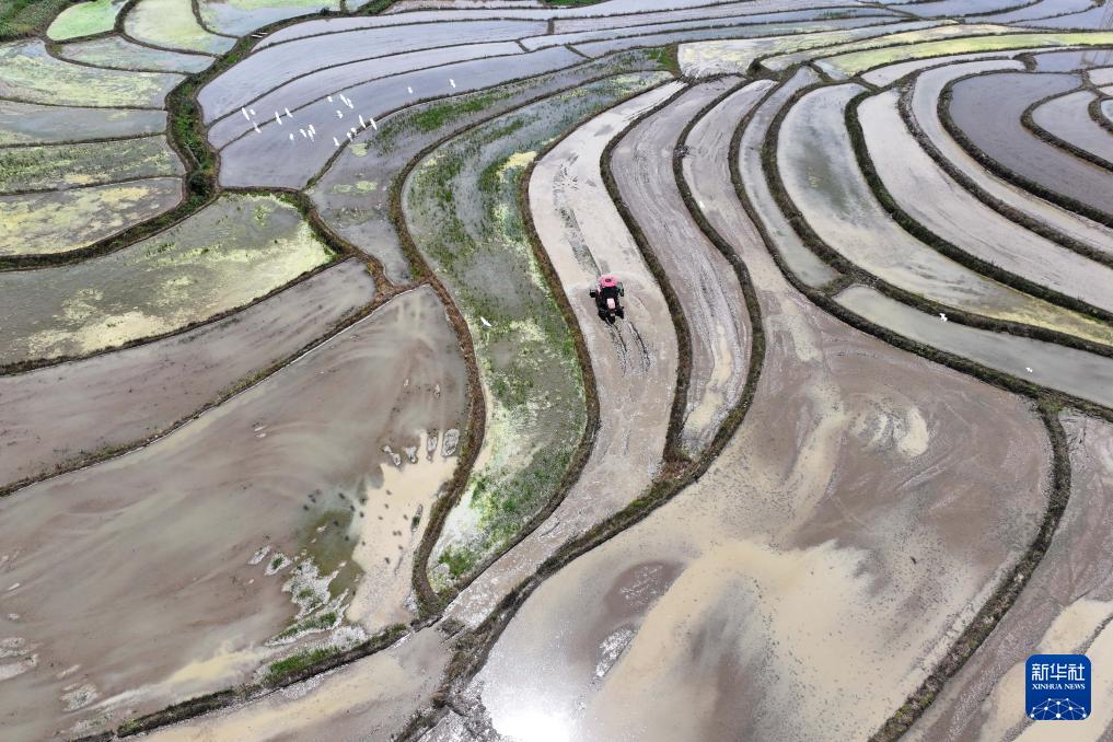 5月14日,在贵州省黔东南苗族侗族自治州岑巩县水尾镇新场村,农机手驾驶农机犁田(无人机照片)。(新华社发 杨云 摄)