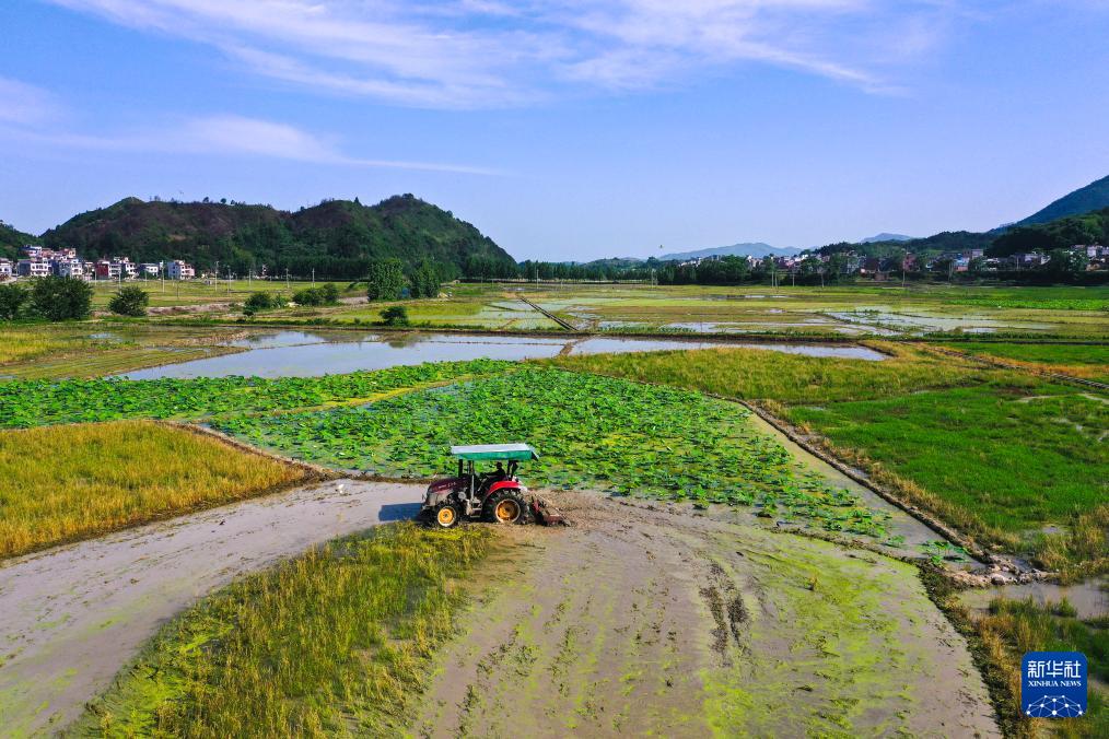 5月14日,湖南省郴州市桂阳县流峰镇农民驾驶农机在翻耕农田(无人机照片)。(新华社发 周秀鱼春 摄)