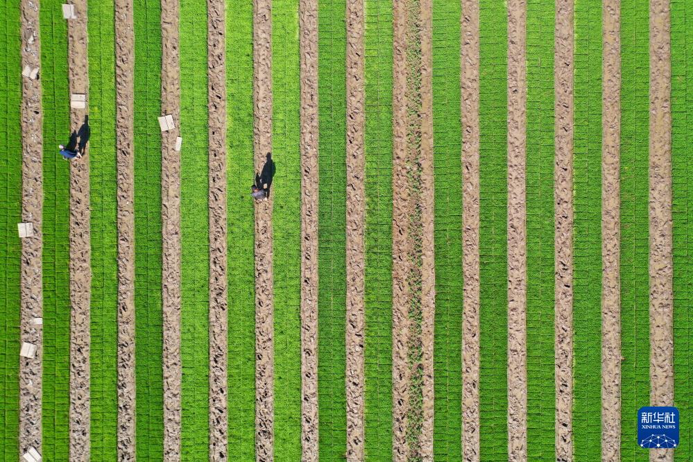 5月15日,山东省青岛市即墨区蓝村街道青香水稻种植专业合作社的农民在育秧基地管护秧苗(无人机照片)。(新华社发 梁孝鹏 摄)