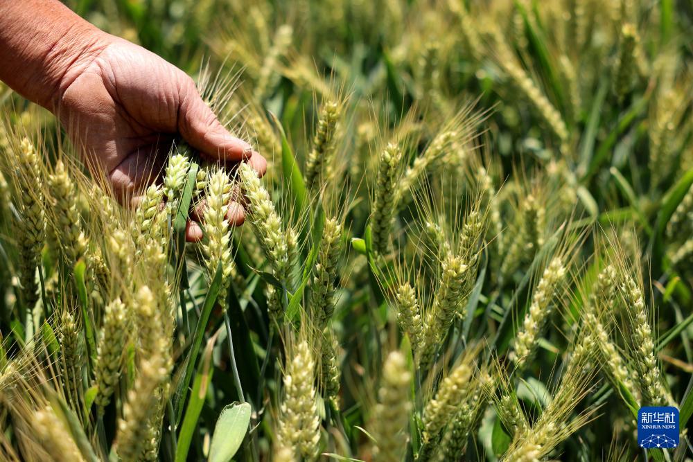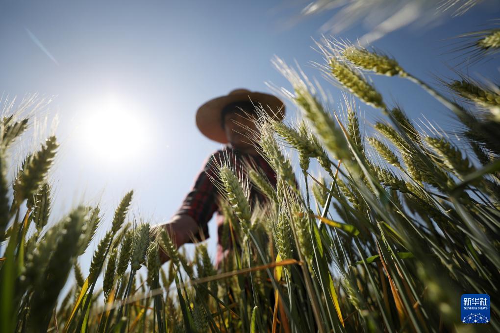 5月15日,山东省枣庄市西王庄镇黄楼村农民在田间查看小麦长势。(新华社发 孙中喆 摄)