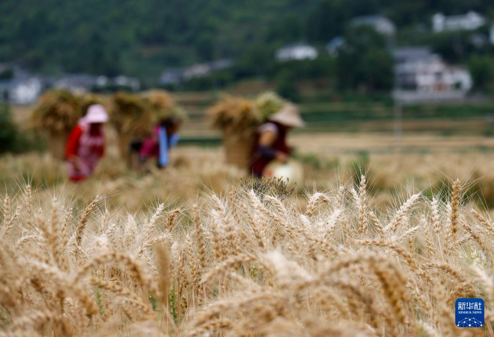 5月15日,村民在贵州省遵义市汇川区团泽镇三联村搬运小麦。(新华社发 田锦泓 摄)