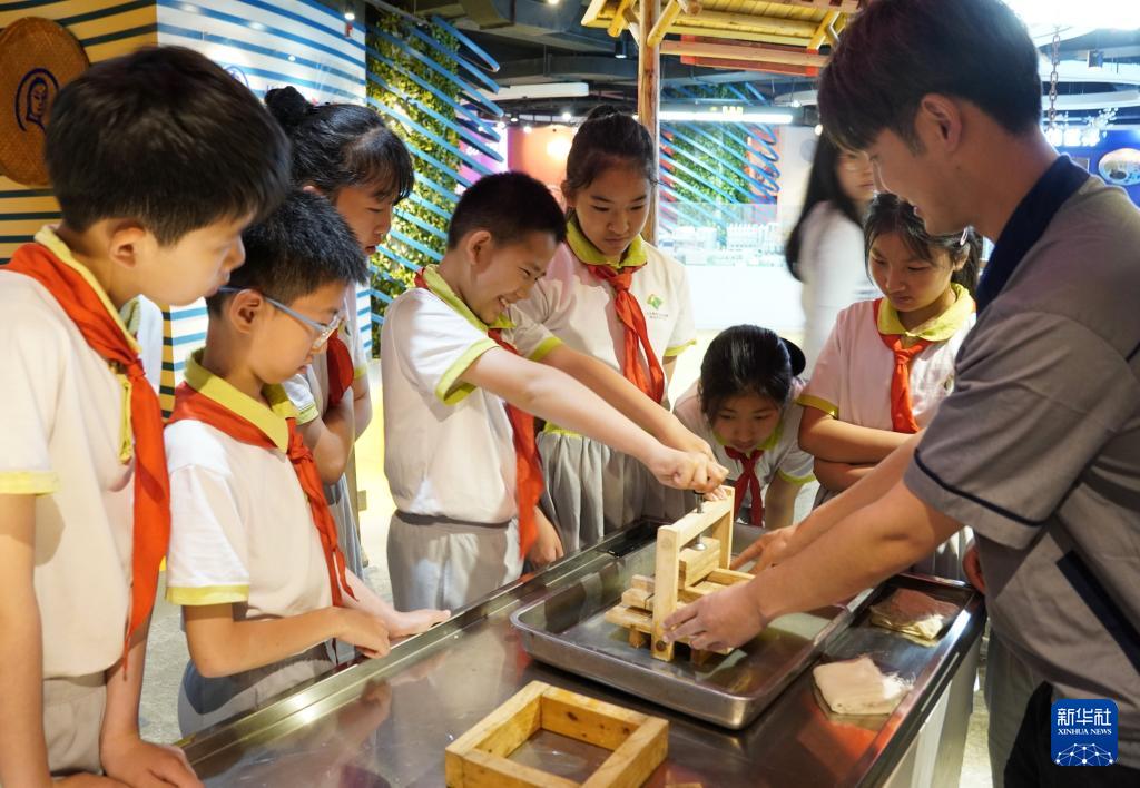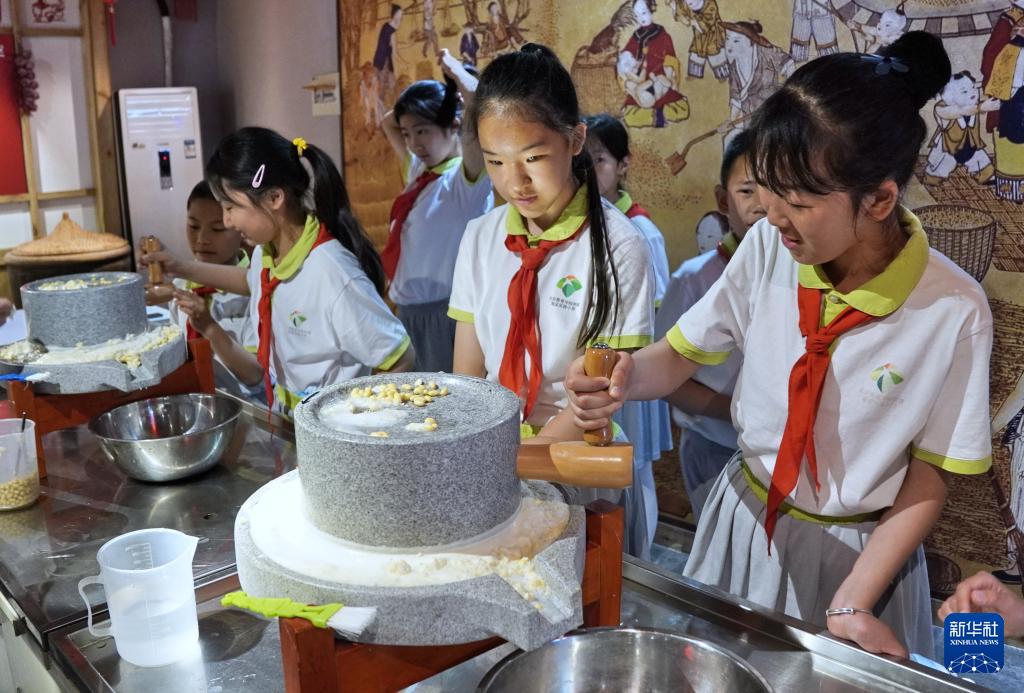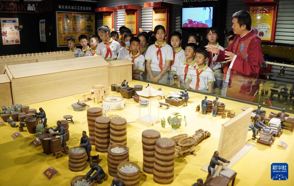 5月16日,北京教育学院附属海淀实验小学的学生们在听工作人员讲述王致和腐乳的历史。(新华社记者 李欣 摄)
