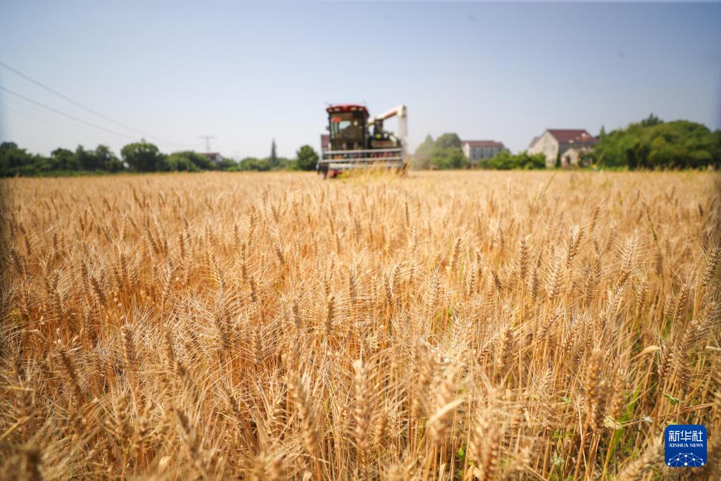 5月18日,在浙江省湖州市德清县钟管镇蠡山村一处麦田,收割机在麦田中作业。(新华社发 王正 摄)