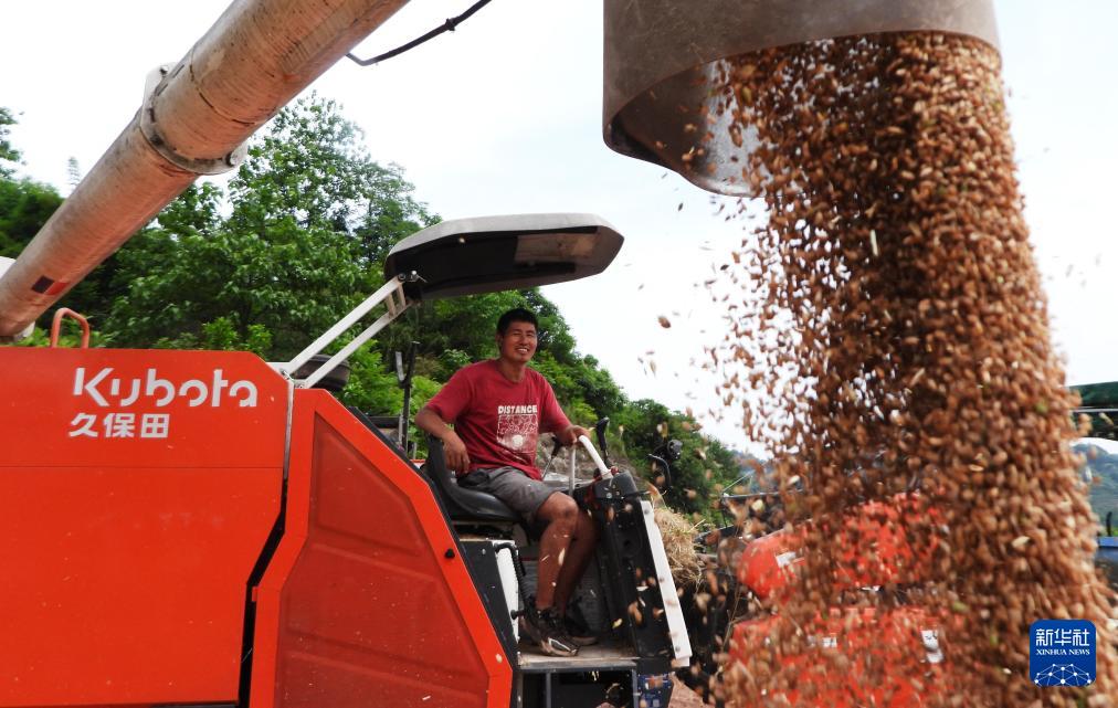 5月19日,在四川省达州市高新区金垭镇龙坪村,农民将刚收割的小麦装车。(新华社发 邓良奎 摄)