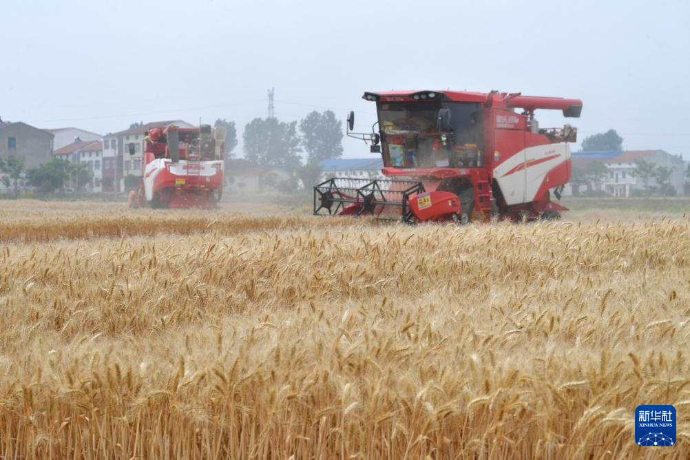 5月18日,在湖北省宜城市小河镇,大型收割机在收割小麦。(新华社发 安富斌 摄)