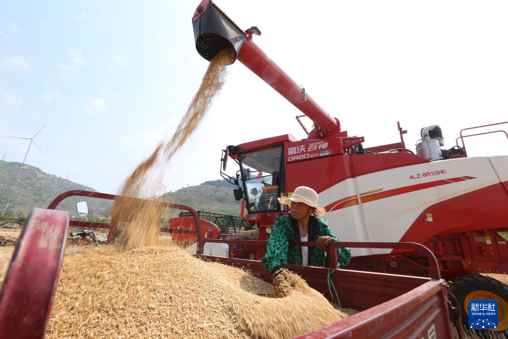 5月19日,在山东省枣庄市山亭区凫城镇文王峪村,农民在收割小麦。(新华社发 王启蒙 摄)