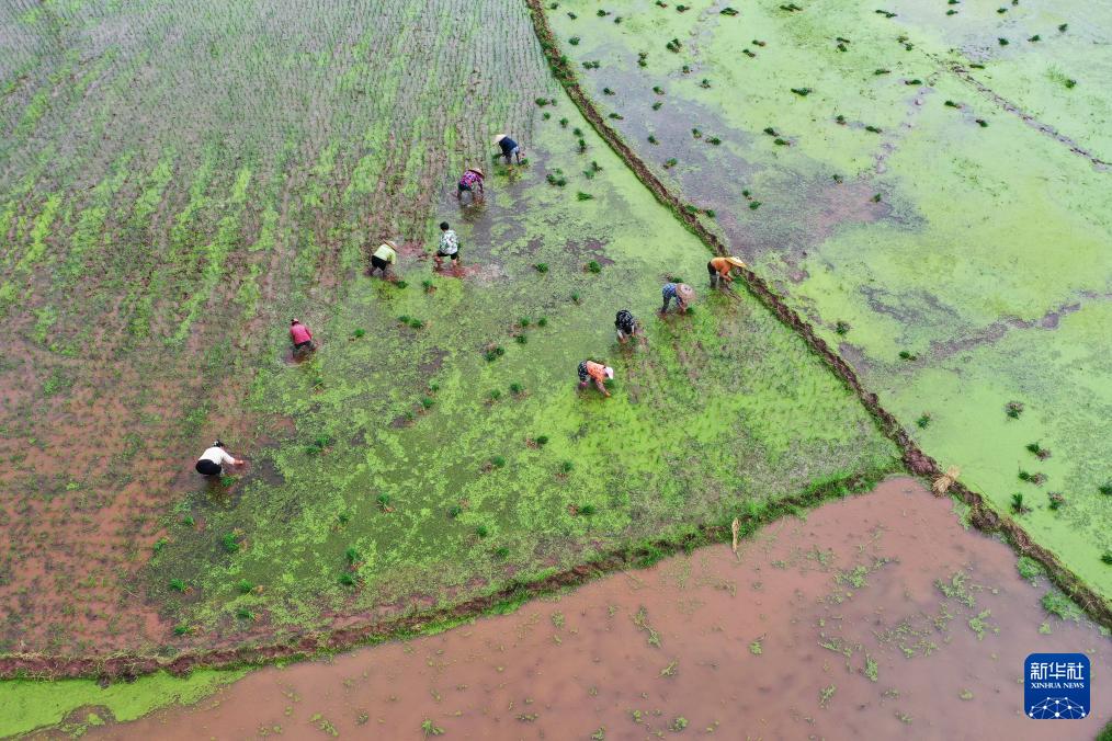 5月20日,在湖南省衡阳县西渡镇新桥村,农民在田间插秧(无人机照片)。(新华社发 刘欣荣 摄)