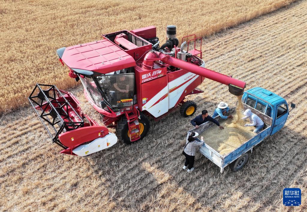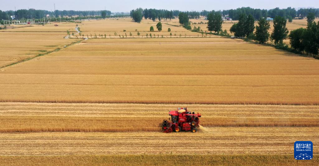 5月20日,大型收割机在河南驻马店市驿城区朱古洞乡的麦田里作业。(新华社发 弓华静 摄)