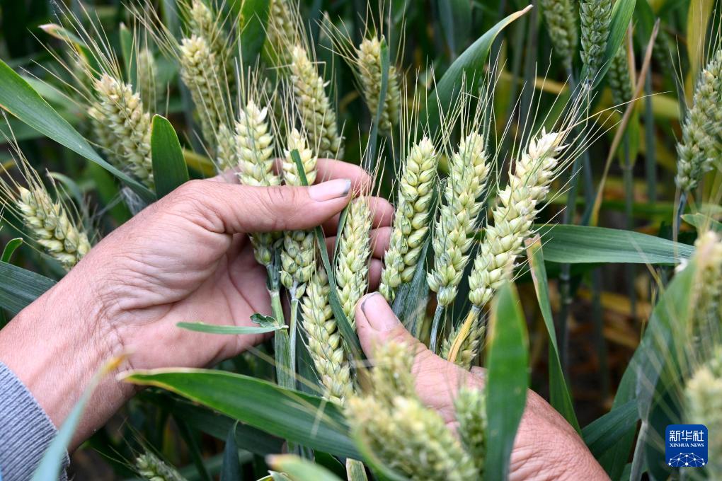5月20日,河北省邯郸市峰峰矿区西固义乡东固义村的农民在麦田查看麦粒饱满程度。(新华社发 郝群英 摄)