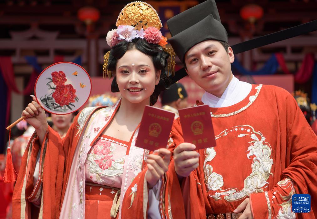 5月20日,在河南省洛阳市上阳宫,参加公益集体传统婚礼的一对新人展示自己的结婚证。(新华社发 张怡熙 摄)