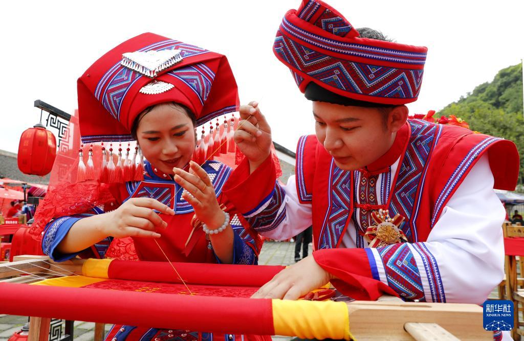 5月20日,在广西忻城县“520”集体婚礼现场,一对新人一起绣婚书。(新华社发 樊绍光 摄)